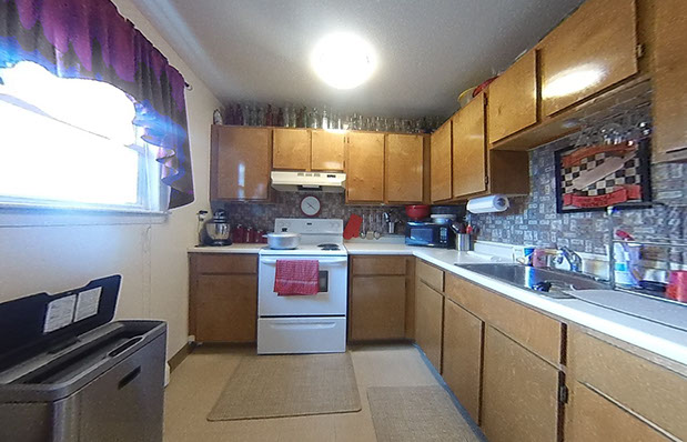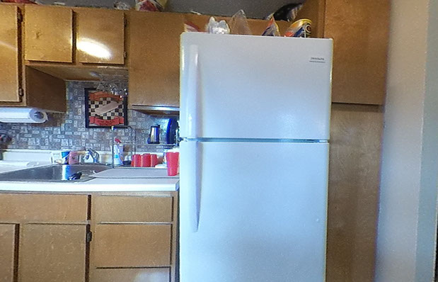 The kitchen comes equipped with a refrigerator, stove, sink and garbage disposal.